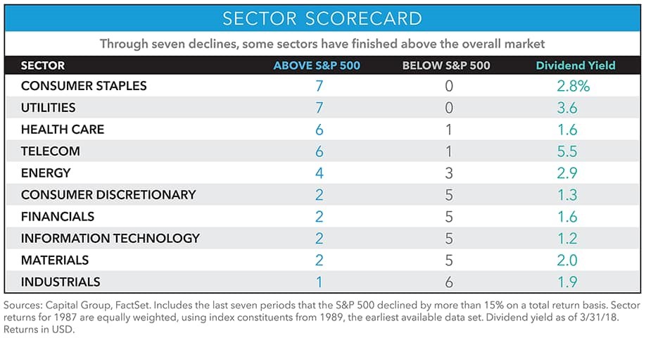 Another way to help protect your portfolio would be through overweighting or underweighting more defensive sectors. The accompanying table, published by Capital Group, highlights the sectors that have outperformed and underperformed the S&P 500 in a sharp market selloff.